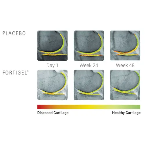 Homogenní směs certifikovaného kolagenu s bioaktivními peptidy FORTIGEL® (u nichž byla vědecky ověřena účinnost), glucosaminu, L-carnitinu, chondroitinu a vitamínu C napomáhá: