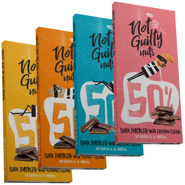 Objevte dokonale vyváženou chuť hořké čokolády a lískooříškové / mandlové / arašídové / kešu náplně v prémiové čokoládě Not Guilty. Vyráběná ručně z vysoce kvalitního kakaa, bez přidaného cukru a palmového oleje. Pro všechny, kdo si chtějí dopřát čokoládu s čistým svědomím.
