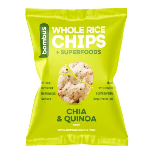 Klíčové vlastnosti:Složení: Chipsy 83% (hnědá celozrnná rýže 85%, chia (Salvia hispanica) 5%, quinoa 5%, jáhly), olivový olej 16%, sůl 1%.