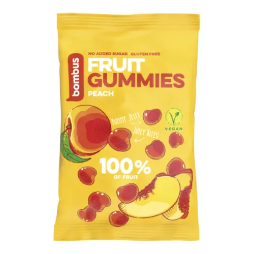 Neodolatelné broskvové gummies vás dostanou svou vůní a svěží ovocnou chutí! Obsahují 100 % ovocné složky a šťávu z černé mrkve. Jsou bez přidaného cukru, barviv a konzervantů a jsou zdravou alternativou přeslazených cukrovinek.