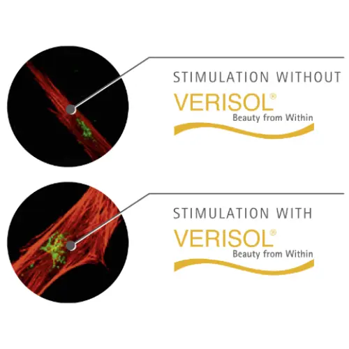 Homogenní směs certifikovaného kolagenu s bioaktivními peptidy VERISOL® (u nichž byla vědecky ověřena účinnost), vitamínu C pro lepší vstřebatelnost, minerálů, koenzymu Q10 a kyseliny hyaluronové, s příchutí višeň.