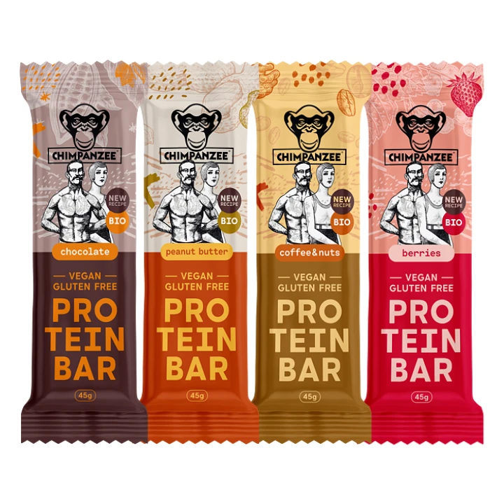 Neznáte příchutě Chimpanzee Bio Protein Bar? Zkuste testovací mix 4 různých proteinových ze 100% bio surovin vyrobené šetrnou metodou raw, bez tepelného zpracování.