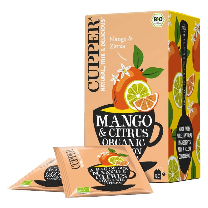 Prémiový ovocný čaj s pomerančovou a limetkovou kůrou a mangovou příchutí, v bio kvalitě.