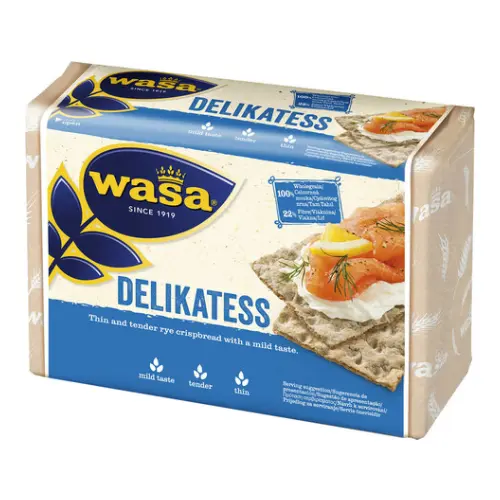 Pouhé dvě ingredience tvoří křupavé plátky Delikatess, a to celozrnná žitná mouka a sůl. Celozrnné krekry jsou ideální volbou ke snídani nebo svačince, která díky nízkému glykemickému indexu zasytí na celé dopoledne. Využít se dají i k večeři, jeden plátek obsahuje jen 126 kJ a je tedy vhodnou volbou i pokud se zrovna snažíte hubnout. V energetické hodnotě odpovídající jednomu krajíci klasického chleba si můžete dopřát celé tři plátky Wasa delikatess.